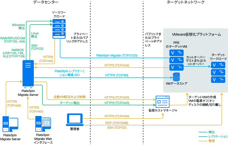 メモ:図 13-1と図 13-2は、自動検出およびWindowsワークロードとLinuxワークロードのネットワーク要件を示しています。別の方法として、ソースワークロード上でMigrate Agentを使用してワークロードを登録し、そのインベントリ詳細をHTTPS (TCP/443)経由でPlateSpin Migrateサーバに送信することができます。セクション 2.6.2, ワークロード登録の要件およびセクション 22.7, Migrate Agentによるワークロードの登録と詳細の検出を参照してください。