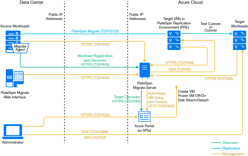 NOTE:Figure 9-1 depicts automated discovery and the network requirements for Windows and Linux workloads. You can alternatively use Migrate Agent on the source workload to register the workload and send its inventory details to PlateSpin Migrate server using HTTPS (TCP/443). See Requirements for Workload Registration and Registering Workloads and Discovering Details with Migrate Agent.