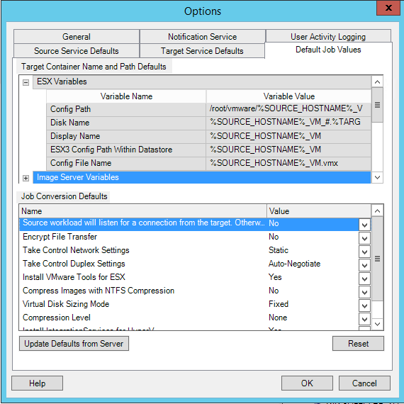 In the Job Conversion Defaults section, set a default value for the following parameters that affect all migration jobs. The settings that you configure during the actual workload migration job overrides these default values.