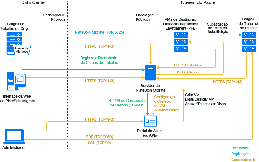 Para uma implantação de servidor do Migrate baseada em nuvem, o Azure Marketplace no ambiente de destino do Azure oferece uma imagem do Servidor do PlateSpin Migrate pré-configurada para suportar o ambiente IaaS do host . A Figura 8-2 mostra o local dos vários componentes em seu ambiente de migração do Azure e as comunicações entre eles. Consulte a Seção 9.2.3, Pré-requisitos do Azure para uso de um servidor do Migrate com base no Azure.