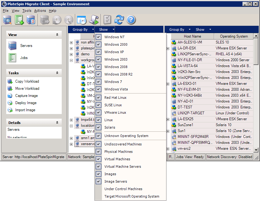 Figura 3-1 Tela Servers do Cliente do PlateSpin Migrate