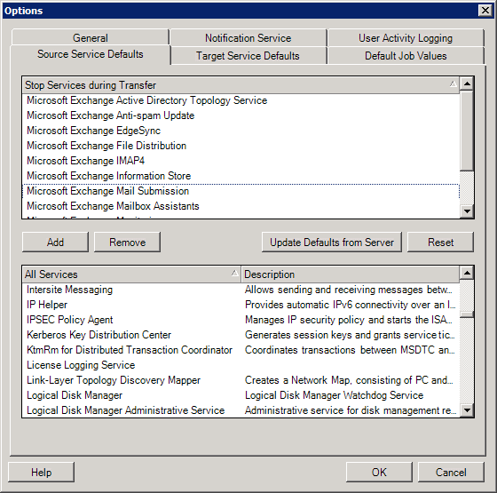 Seção Stop Services during Transfer: Lista os serviços que são interrompidos por padrão. Para interromper um serviço durante uma transferência de dados que usa um método de transferência específico por padrão, marque a caixa de seleção correspondente. Uma caixa de seleção desmarcada significa que o serviço permanece ativo durante a Transferência Ativa.