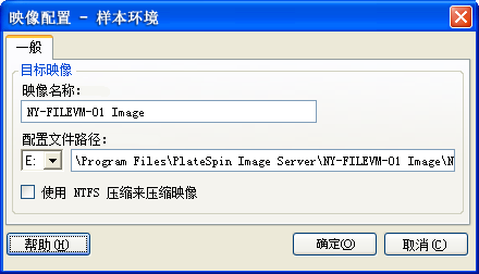 • 映像配置: 指定映像名称、用于储存映像的位置的路径,以及是否使用 NTFS 压缩(在“映像配置”下,单击一般)。