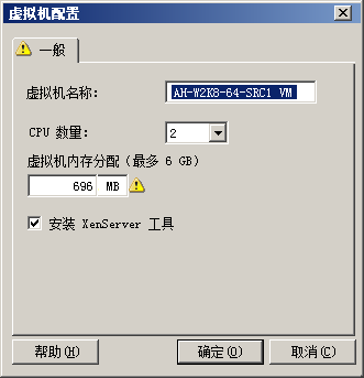 2. 有关“虚拟机配置”对话框中特定于主机的目标 VM 配置选项,请参见目标 VM 配置:Citrix XenServer