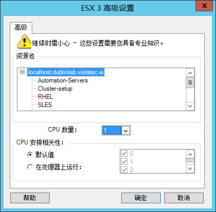 下面是特定于低于 vSphere 5 的 VMware ESX 系统的配置选项。要访问用于控制资源池、CPU 数量和 CPU 安排相关性的设置,请单击高级