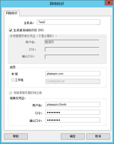 主机名:为目标计算机指定所需的主机名。 生成新 SID:如果选中此选项,会为目标工作负载指派一个新系统标识符 (SID)。仅当迁移 Windows 2008 时才需要身份凭证,而且它们必须是本地(嵌入)管理员帐户的身份凭证。如果此帐户在源本地已重命名,请提供其新名称。 (域/工作组)成员:选择所需的选项,并键入您希望目标计算机加入的域或工作组的名称。 保留源服务器的域注册:保留域注册,并确保迁移期间源服务器域注册状态保持不变。如果禁用此选项,源计算机的域帐户将会转移到目标计算机。源服务器依旧显示为在域中,但已没有有效的连接。 域身份凭证:如果目标计算机属于某个域,请指定有权将服务器添加到该域的用户帐户的有效身份凭证,例如域管理员组或企业管理员组的成员。 |