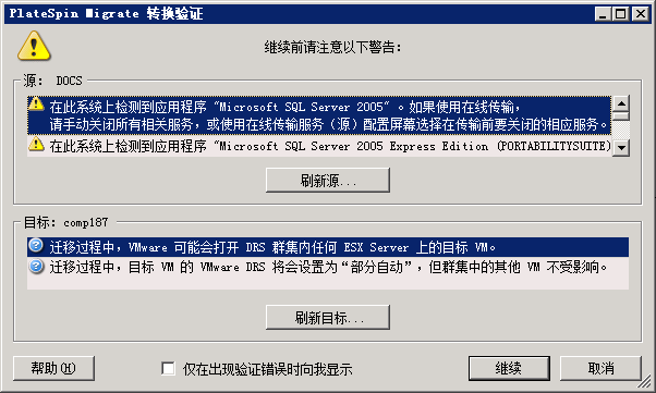 在默认的 PlateSpin Migrate 配置中,验证讯息显示在“操作”窗口的底部。不过,如果您已将 PlateSpin Migrate 配置为在拖放过程中略过“操作”窗口,错误和警告将会显示在另一个窗口中: