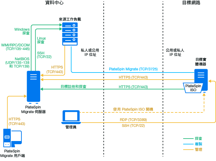 附註:圖 18-1 描述了 Windows 和 Linux 工作負載的自動探查和網路要求。您也可以使用來源工作負載上的 Migrate 代理程式來註冊工作負載,並使用 HTTPS (TCP/443) 將其庫存詳細資料傳送至 PlateSpin Migrate 伺服器。請參閱節 2.6.2, 工作負載註冊的要求節 22.7, 使用 Migrate 代理程式註冊工作負載並探查詳細資料