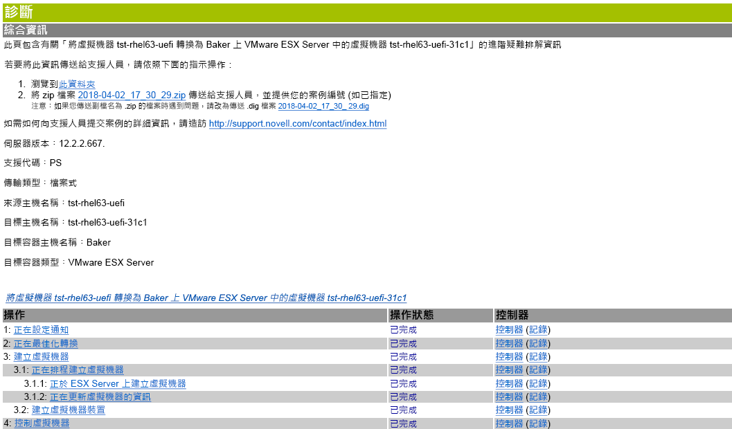 在 Migrate Web 介面中,當您執行某個指令後,可以產生有關該指令詳細資料的詳細診斷報告。