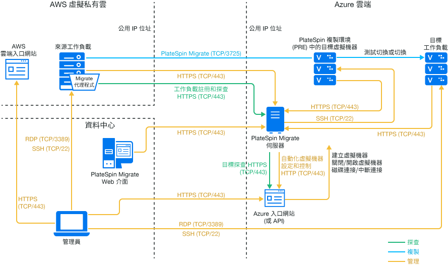 PlateSpin Migrate 支援將工作負載從 Amazon Web Services EC2 雲端移轉至 Microsoft Azure 雲端。
