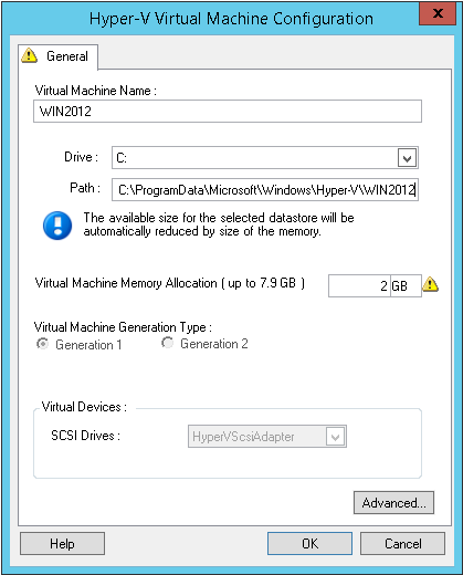 Virtual Machine Name: Specify the display name for the new virtual machine. Datastore: Select the datastore where you want to create the *.vmx file. Configuration File Path: Specify a name and the directory path for the virtual machine’s *.vmx configuration file. Virtual Machine Memory Allocation: Specify a value for the amount of virtual RAM to be assigned to the virtual machine. Virtual Machine Generation Type: Specifies the generation type for the new virtual machine.
