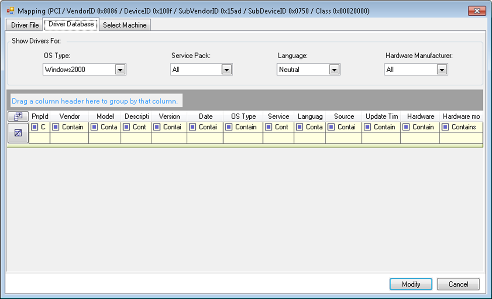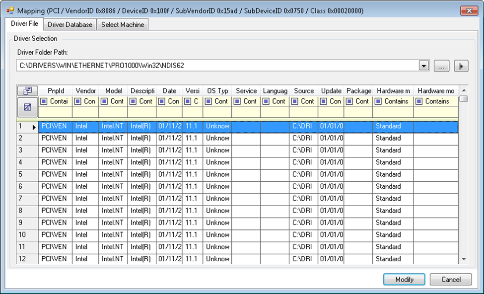 Under the Driver Database tab, browse to and select the existing driver database, select the correct PnP ID, then select Modify.