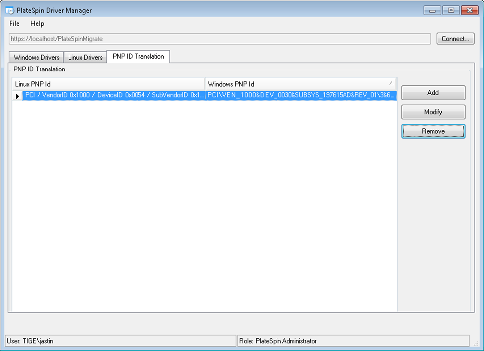 These IDs are formatted consistently, so PlateSpin can apply a standard transformation to each of them to determine its corresponding Windows PnP ID. The translation occurs automatically within the PlateSpin product. The feature enables you or a support technician to add, edit or remove custom PnP mappings.