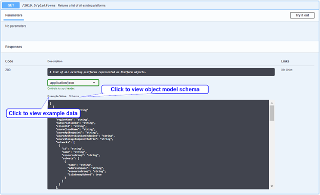 For example, Figure 2-5 shows the platform type with information about its fields and values to specify in a request body.