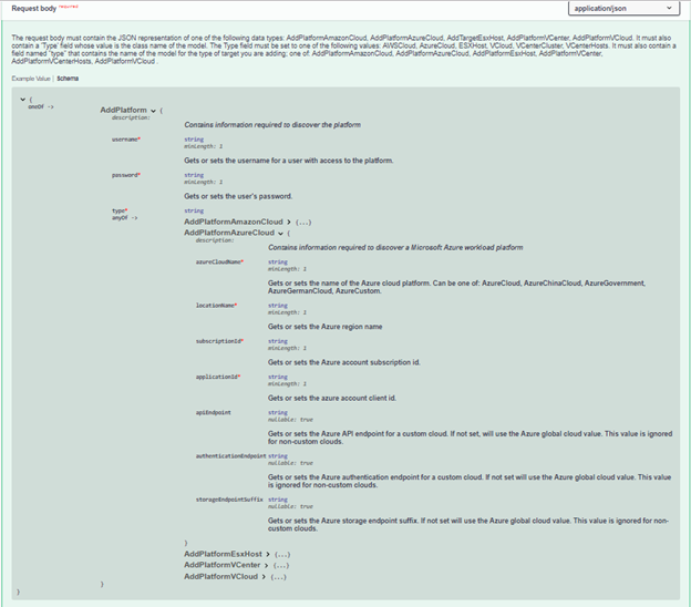 The schema definition for AddPlatformAzureCloud indicates what information is needed to add a new Azure location to the Migrate Server. The POST request body would be similar to the following: