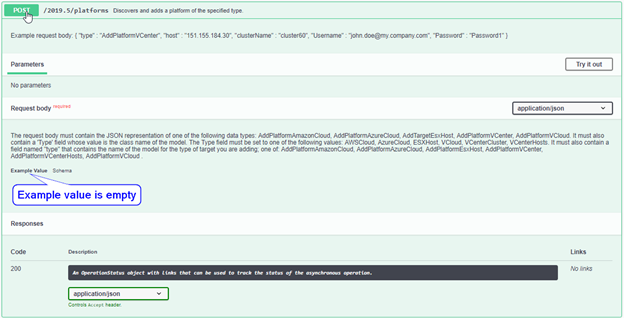 For example, Figure 2-4 displays details for Platforms > POST. It identifies fields and values that you can use in the request body. The Example Value panel is empty. A superscripted key word in red font next to the Request Body title indicates if the request body content is required or optional.