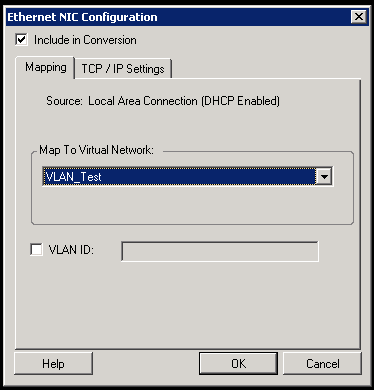 Map to Virtual Network: From the drop-down list, select the virtual switch or network to use for communications. If multiple virtual network adapters are present, select the adapter that can communicate with both the PlateSpin Server and the source machine. This network can differ from the network on which the target virtual machine will run after the migration. VLAN ID: (Applicable for target machine on a Hyper-V server only) Enable this option to specify the virtual network ID to be used on the target machine. If you do not specify this ID, then the virtual network ID of the source machine is used by default. TCP/IP Settings tab: Click the tab to access TCP/IP and advanced network settings. See TCP/IP and Advanced Network Settings. |