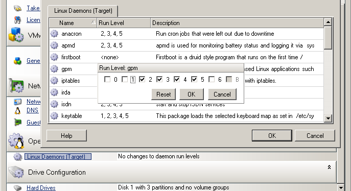 2. Select Linux daemons’ start conditions on the target VM. Enable the daemon to start by selecting the check boxes at the appropriate runlevels (0 to 6) and Boot.