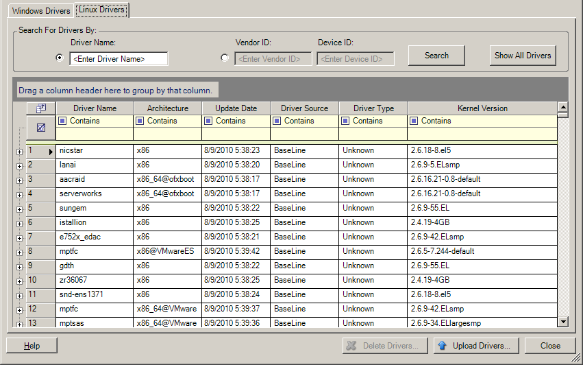 Click Tools > Manage Device Drivers and select the Linux Drivers tab: