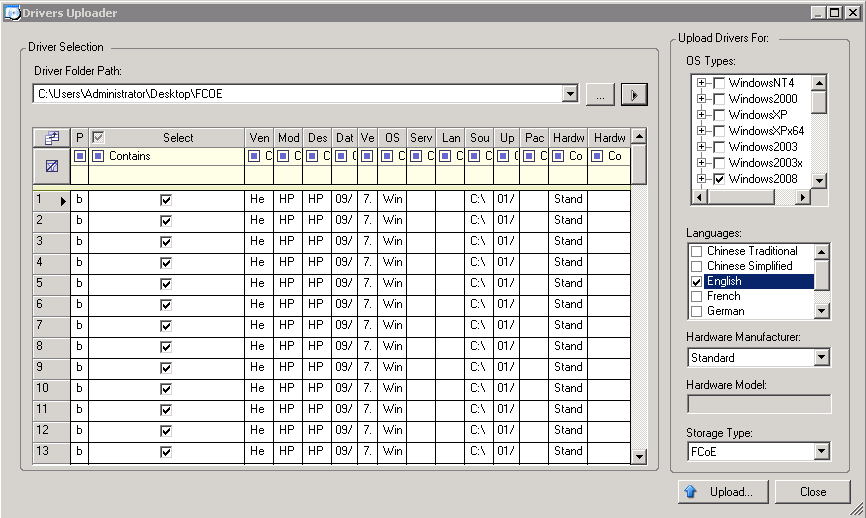 Browse to the folder that contains the required driver files, and select applicable OS type, language, and hardware manufacturer options.