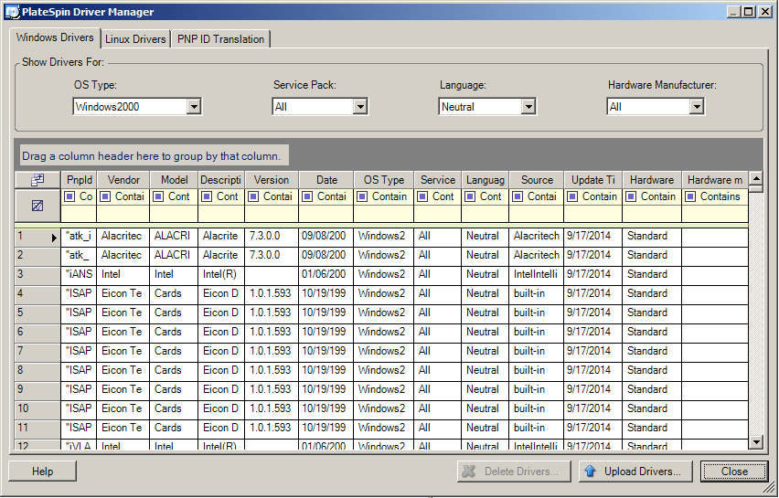Use the PlateSpin Driver Manager to upload device drivers to the driver database.