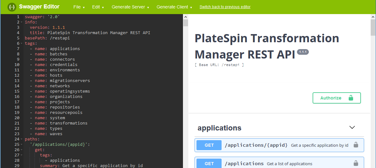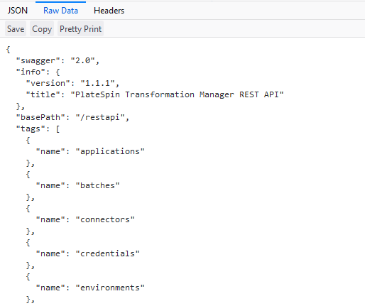 PlateSpin Transformation Manager is compliant with the OpenAPI Specification, formerly known as the Swagger RESTful API Documentation Specification. You can use the open source Swagger Editor to generate a REST client in your language of choice.