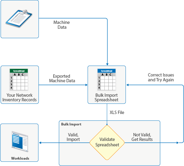 The Spreadsheet Import workflow, shown in Figure A-1, includes the tasks you perform to prepare the data for import, as well as the tasks required to validate that data before you can import it to your PlateSpin Transformation Manager environment.