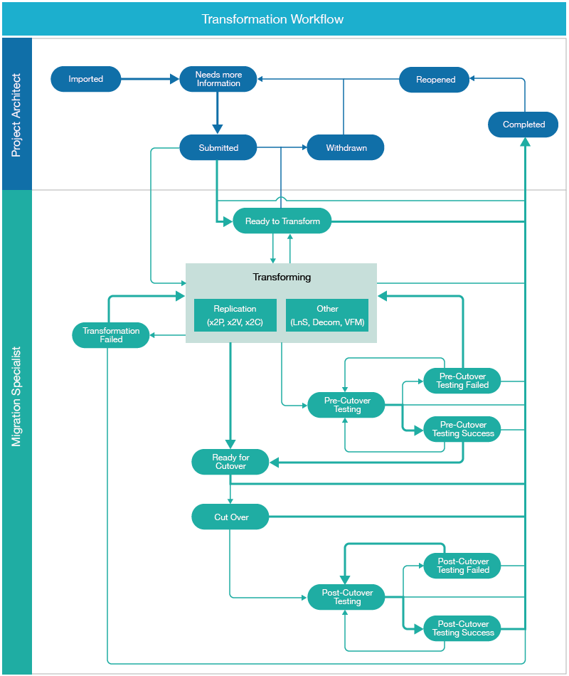 The Transformation Workflow diagram represents the overall logical flow of states in a workload transformation. Some states are not available, depending on whether the workload transformation is set to Automated Mode or Planning Mode. For example, after an automated cutover is completed successfully, the migration job is complete and you cannot reopen the same migration job.